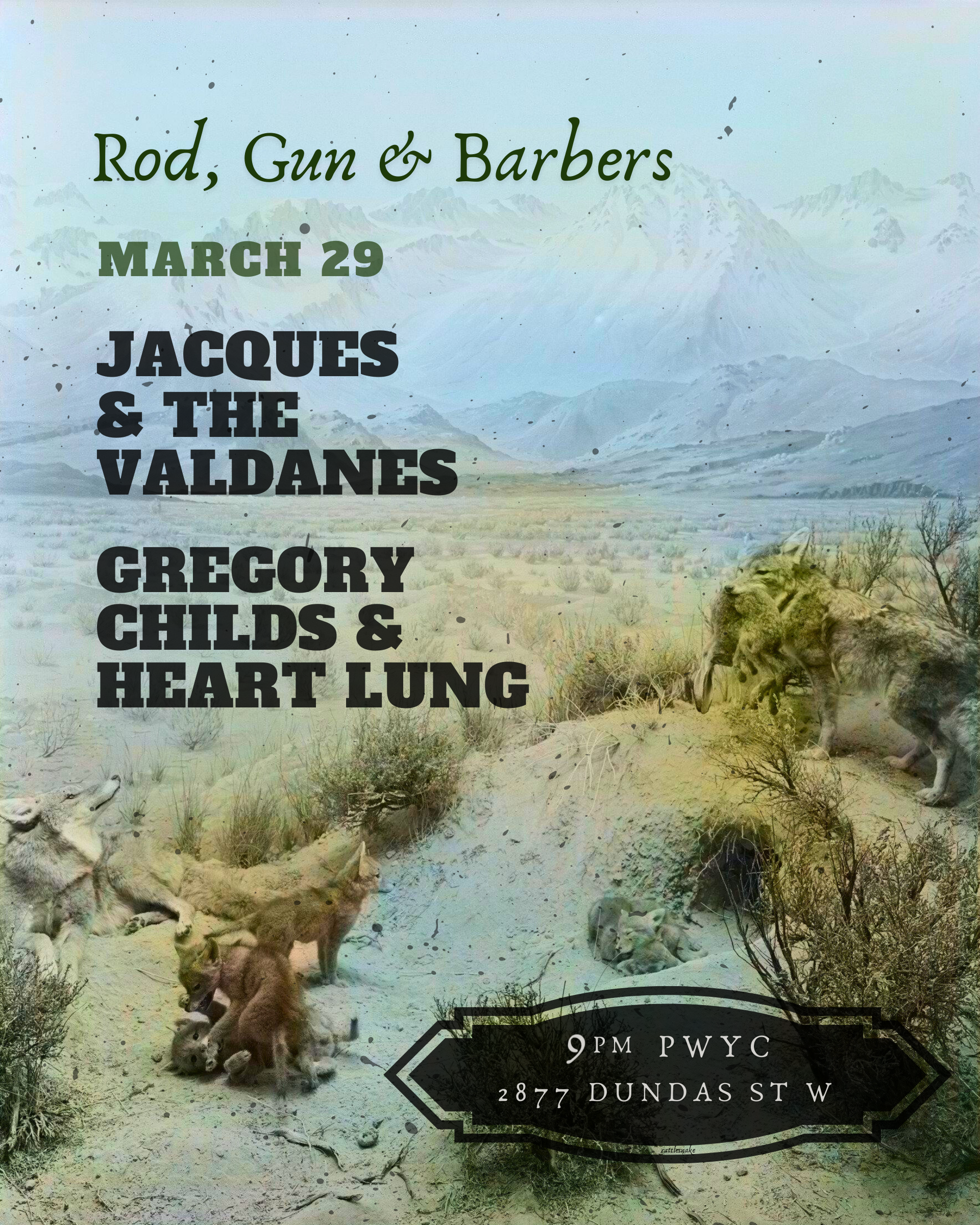 ShowsMarch 29, 2025Rod, Gun & Barbers w/ Jacques & The Valdanes March 29th, 2025 / Doors at 9pm R&G with Jacques & the Valdanes – swapping sets and playing till late. PWYC Location gregory childs, jacques & the valdanes, Junction, pwyc, Rod Gun & Barbers, toronto Previous The Cameron House | February Wednesdays Next Horseshow Tavern w/ Josh Bravener & The Hypochondriacs
